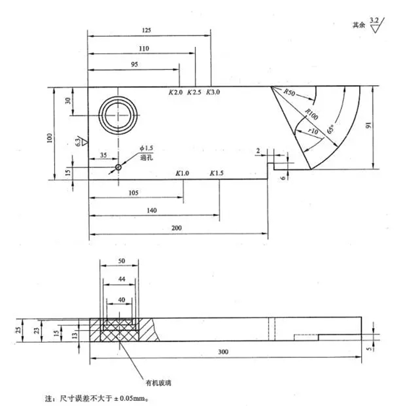 CSK-IA試塊是我國(guó)承壓設(shè)備無(wú)損檢測(cè)標(biāo)準(zhǔn)NB/T47013中規(guī)定的標(biāo)準(zhǔn)試塊,其結(jié)構(gòu)尺寸如圖所示。