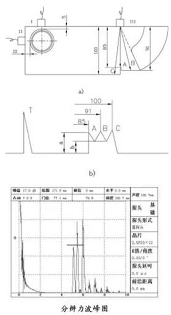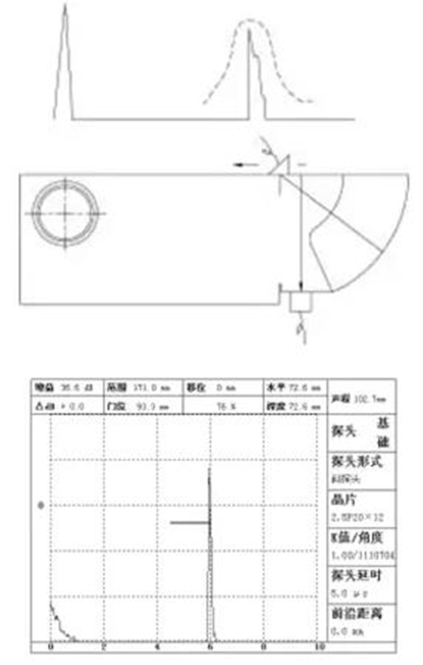 根據(jù)AVG原理,在探頭探傷時(shí)可把R100mm圓弧面視為大平底反射,以此來(lái)調(diào)整探測(cè)靈敏度。直探頭探傷時(shí)可把厚度為25/100mm的幾個(gè)側(cè)面視為大平底處理,以此來(lái)調(diào)整靈敏度。另外,也可以根據(jù)探傷要求,儀測(cè)量1.5mm橫通孔反射波來(lái)確定靈敏度。