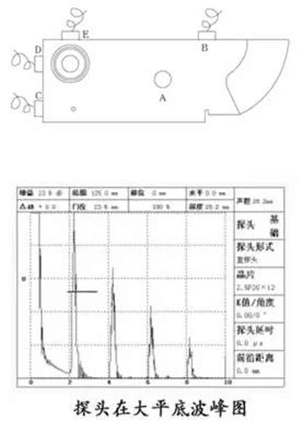 將探傷儀的抑制和補(bǔ)償旋鈕置于“0”或“關(guān)”用直探頭放置在圖中A或B位置。并保證探頭與試塊之間有良好的聲耦合。