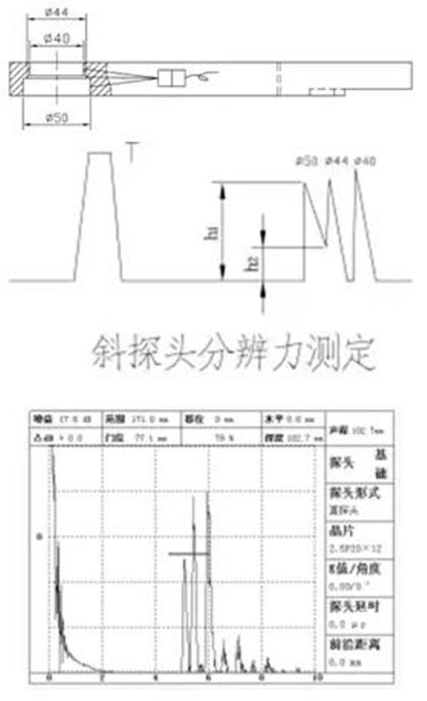 (2)平行移動(dòng)探頭并調(diào)節(jié)儀器,使50mm、44mm回波等高,如圖所示,其波峰和波谷分別為h1、h2,其分辨力為