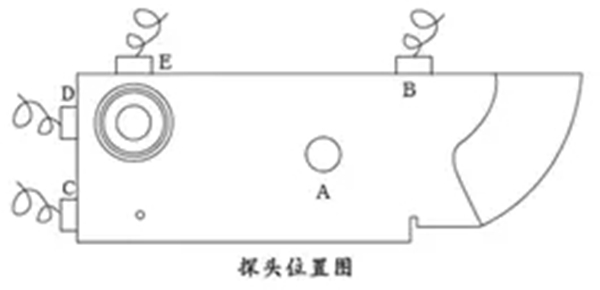 盲區(qū)是指最小的探測(cè)距離,測(cè)試方法是:將直探頭置于探頭位置圖中D、E位置,測(cè)量50mm圓孔反射波。從而可以估計(jì)出盲區(qū)小于等于5mm或大于等于10mm,或者介于兩者之間。
