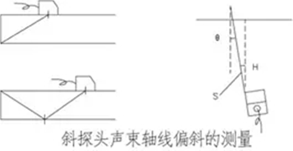 在CSK-ⅠA試塊上厚25mm的平面上,使聲束指向棱邊,對(duì)于K值小于等于1的探頭,聲束經(jīng)底面反射指向上棱角;K值大于1的聲束指向下棱角,前后左右擺動(dòng)探頭,使所測(cè)棱邊端角回波幅度最高,固定探頭不動(dòng),然后用量角器或適當(dāng)?shù)姆椒y(cè)量斜探頭幾何中心聲束軸線與棱邊法線的夾角(例如測(cè)量探頭斜面與試塊端面垂直線的夾角),即為聲束軸線偏斜角。應(yīng)當(dāng)注意:斜探頭的聲束擴(kuò)散角較大時(shí),可能影響到最大回波的探測(cè),以致可能產(chǎn)生較大的測(cè)量誤差。